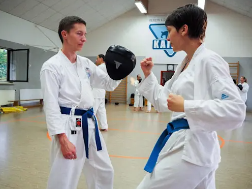 Um im Verteidigungsfall Karatetechniken nutzen zu können, müssen deren Funktion und Wirkung an Schlagpolster und Partner trainiert werden.
